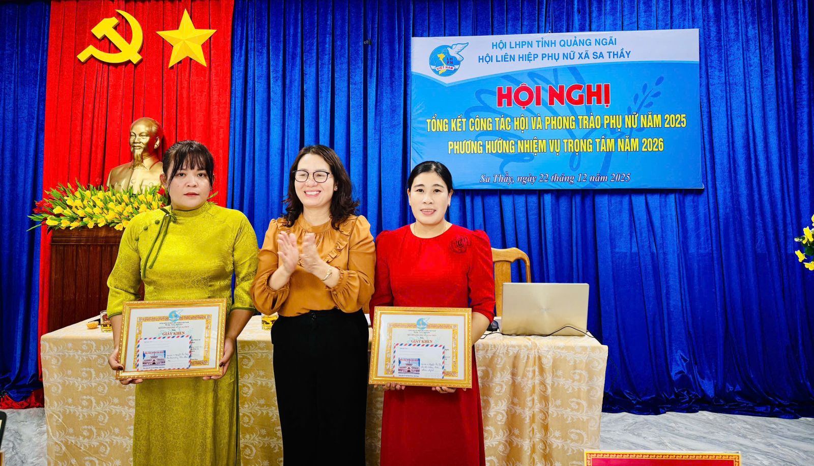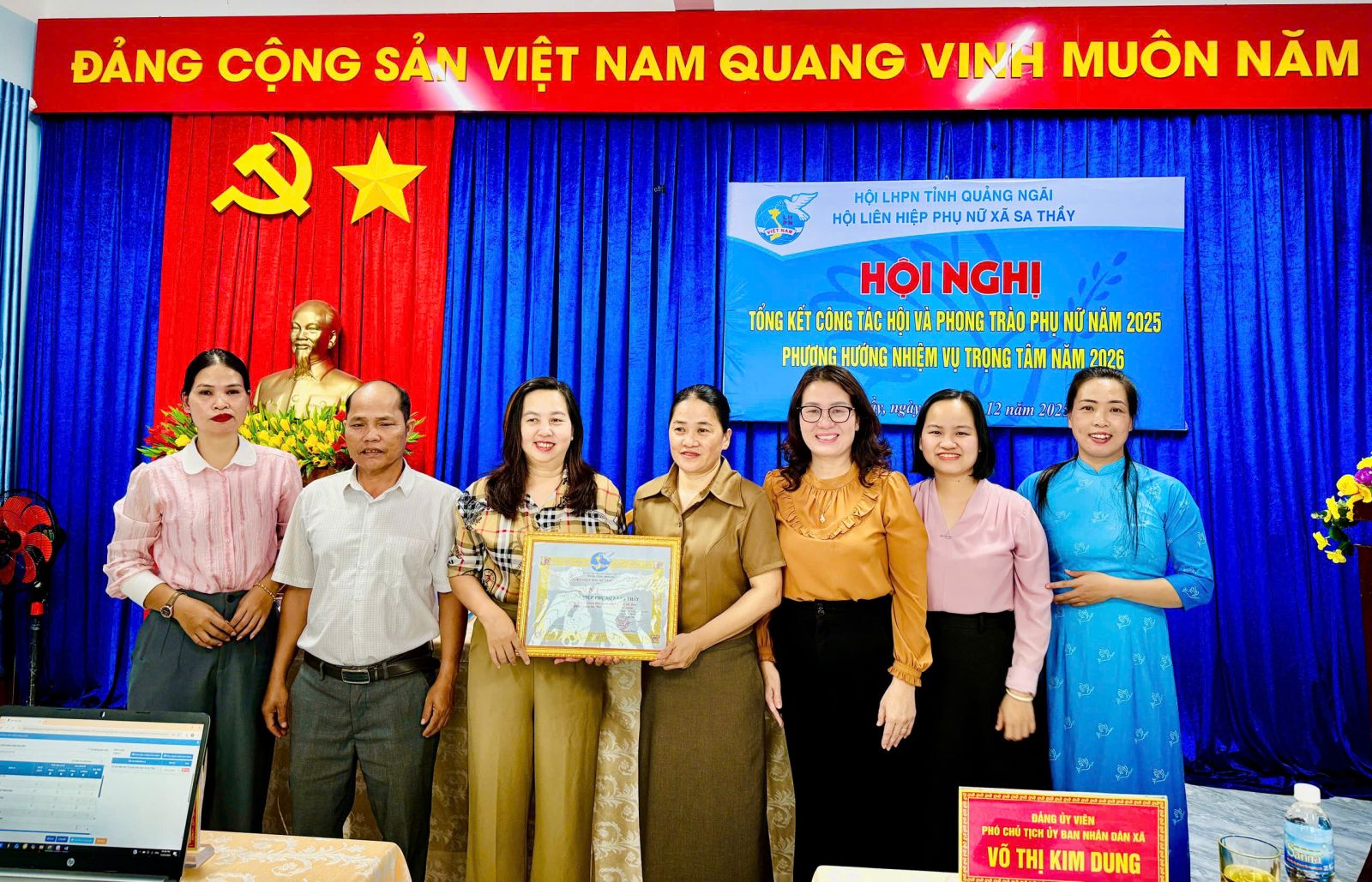Nhân dịp này, Hội LHPN tỉnh Quảng Ngãi đã khen thưởng cho 01 tập thể Hội LHPN xã Sa Thầy đã có thành tích trong thực hiện phong trào thi đua và nhiệm vụ công tác hội nhiệm kỳ 2021-2026 và 01 cá nhân đạt danh hiệu “ cán Bộ hội cơ sở giỏi” nhiệm kỳ 2021-2026; Hội LHPN xã Sa Thầy đã khen thưởng 6 tập thể, 2 cá nhân có thành tích xuất sắc trong công tác Hội và phong trào phụ nữ năm 2025.