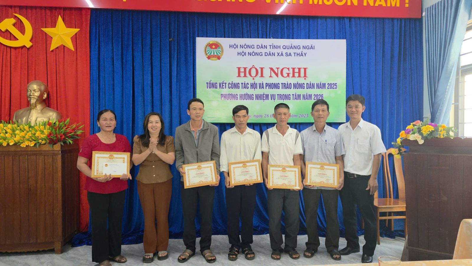 Phát biểu chỉ đạo tại hội nghị, đồng chí Võ Thị Tuyết - Phó Bí thư thường trực Đảng ủy xã ghi nhận và đánh giá cao những kết quả mà Hội Nông dân xã đã đạt được trong năm 2025. Đồng thời đề nghị trong thời gian tới, Hội Nông dân xã tiếp tục bám sát sự lãnh đạo của cấp ủy, đổi mới nội dung, phương thức hoạt động; đẩy mạnh tuyên truyền, vận động hội viên tham gia hiệu quả các phong trào thi đua, nhất là phong trào sản xuất, kinh doanh giỏi, phát triển kinh tế tập thể, góp phần thực hiện thắng lợi các mục tiêu phát triển kinh tế - xã hội của địa phương. Thay mặt Ban Thường trực Ủy ban MTTQ Việt Nam xã, đồng chí Tạ Thị Diệu - Ủy viên BTV Đảng ủy, Chủ tịch UB MTTQ Việt Nam xã đề nghị Hội Nông dân xã tiếp tục phát huy vai trò thành viên nòng cốt trong khối đại đoàn kết toàn dân tộc; tăng cường phối hợp với MTTQ và các tổ chức chính trị - xã hội trong công tác tuyên truyền, vận động Nhân dân chấp hành tốt chủ trương của Đảng, chính sách, pháp luật của Nhà nước; tích cực tham gia các cuộc vận động, phong trào thi đua yêu nước, công tác an sinh xã hội và giám sát, phản biện xã hội ở cơ sở. Tại Hội nghị, Ban Chấp hành Hội Nông dân tỉnh Quảng Ngãi đã tặng Bằng khen cho Chi hội Nông dân thôn Nhơn Nghĩa, xã Sa Thầy và ông Huỳnh Văn Hồng - Chi hội trưởng Chi hội Nông dân thôn 3 vì đã có thành tích xuất sắc trong hoạt động Hội và phong trào nông dân nhiệm kỳ 2023 - 2028; đồng thời tặng Bằng khen cho ông Bùi Văn Thanh - nông dân sản xuất, kinh doanh giỏi có thành tích xuất sắc trong phong trào thi đua yêu nước của Hội Nông dân tỉnh giai đoạn 2020 - 2025. Bên cạnh đó, Ban Thường vụ Hội Nông dân xã Sa Thầy đã quyết định khen thưởng 2 tập thể và 6 cá nhân có thành tích tiêu biểu trong công tác Hội và phong trào nông dân năm 2025.