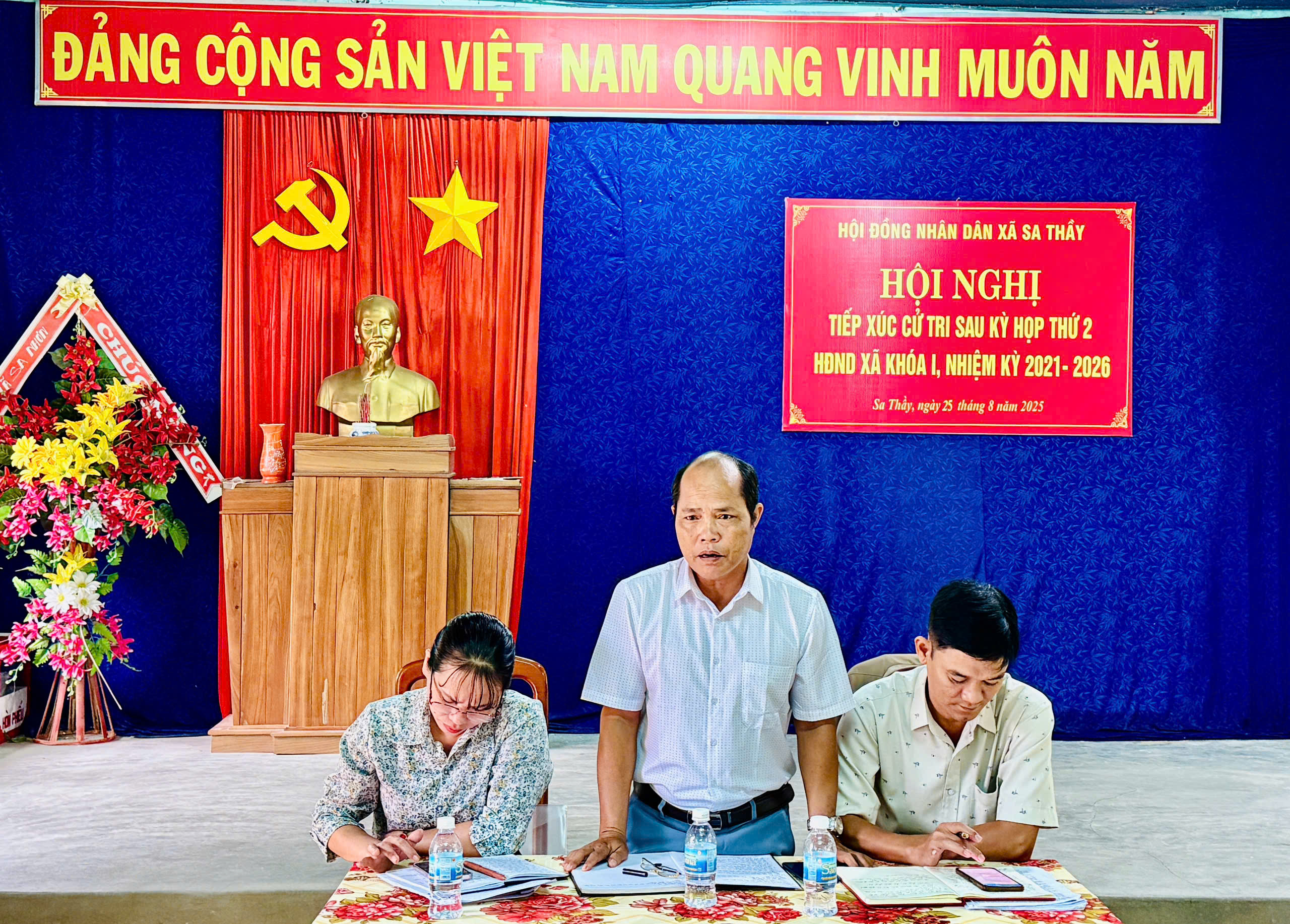 Ngày 25/8/2025, Tổ đại biểu hội đồng nhân dân xã Sa Thầy đã có buổi tiếp xúc cử tri tại các thôn trên địa bàn xã. Tham dự buổi tiếp xúc có đồng chí A Đinh - Ủy viên Ban Thường vụ Đảng ủy, Phó Chủ tịch hội đồng nhân dân xã; lãnh đạo các ban, ngành của xã cùng đông đảo cử tri địa phương.